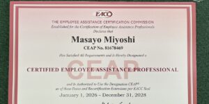代表者 三好 真代 Miyoshi Masayo ◆ 国家資格キャリアコンサルタント ◆1級キャリアコンサルティング技能士 ◆メンタルヘルスマネジメント検定Ⅱ種 ◆両立支援コーディネーター ◆健康経営エキスパートアドバイザー ◆EAPコンサルンタント ◆CEAP(国際EAPプロフェッショナル)
